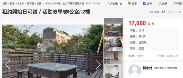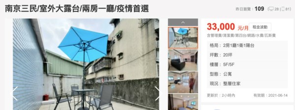 5月中疫情再起,全台進入三級警戒,不少人宅在家裡,如果房子有個大露台,還能走走伸展一下,讓露台戶討論度變高。搜尋租屋網,不少物件主打露台,尤其是疫情衝擊嚴重的萬華區,萬大路上17坪的房子開價1.7萬元,首頁顯圖就用大露台的照片,強調「空氣流通」,防疫期間也可賞屋,露臺戶不愧躍租屋網的主打星。