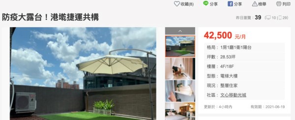 疫情爆發影響房地產市場,不過也帶動另外一波特殊需求的物件,租屋網上有多筆主打「防疫」的露台戶,吸引不少人詢問,不過,專家分析,對於露台戶的需求可能只是曇花一現,還是要看物件本身的條件。