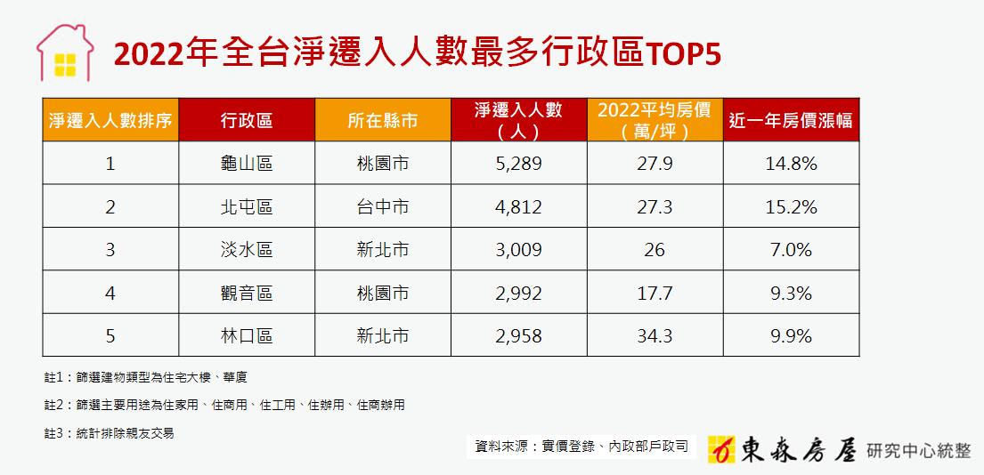 眼看蛋黃區的房價和生活成本居高不下,不少民眾紛紛「用腳投票」,離開市中心搬到更加宜居的地方。東森房屋研究中心彙整內政部戶政司資料發現,2022年全台淨遷入人數最多的行政區是桃園市的龜山區、淨遷入5,289人,其後分別是北屯區(4,812人)、淡水區(3,009人)、觀音區(2,992人)和林口區(2,958人),而且進一步觀察實價登錄資料還可以發現,以上5大人口遷入熱區的房價分別有7%~15%的驚人漲幅。對此,東森房屋研究中心副理黃勝暉指出,以上5個行政區都是房價相對親民或有建設利多挹注的區塊,自然備受廣大民眾青睞,房市前景也同樣值得期待。