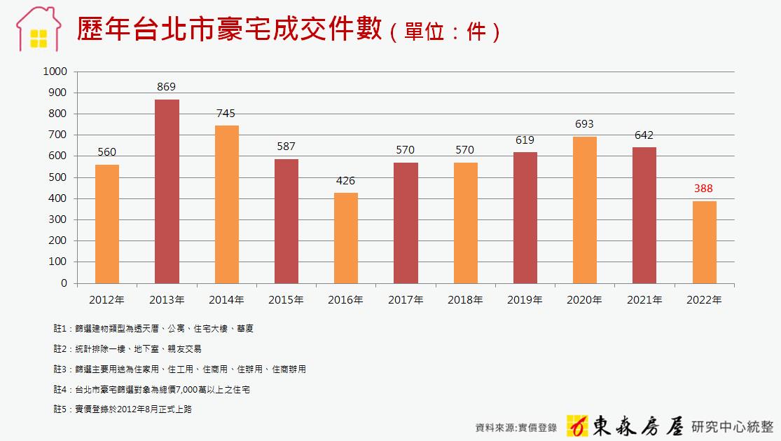 前幾年,受到全球QE、中美貿易戰、投資台灣三大方案等因素影響,市面上熱錢湧現,大量資金挹注不動產市場,豪宅作為高淨值族群的熱門抗通膨標的之一,其買氣也逐漸復甦。不過,去年全台房市快速降溫,豪宅市場的交易量能也隨之走弱,東森房屋研究中心彙整實價登錄資料發現,2022年台北市總價高於7千萬的豪宅成交件數僅有388件,是有統計數據以來的歷史新低,而且相較於2021年的642件,驟減254件,大幅減少4成、幾近腰斬。對此,東森房屋台北松高加盟店店長林梅雀表示,豪宅買氣降溫,部分屋主心態也悄悄鬆動,對於有購置豪宅需求的民眾來說,剛好可以趁現在大膽進場議價。