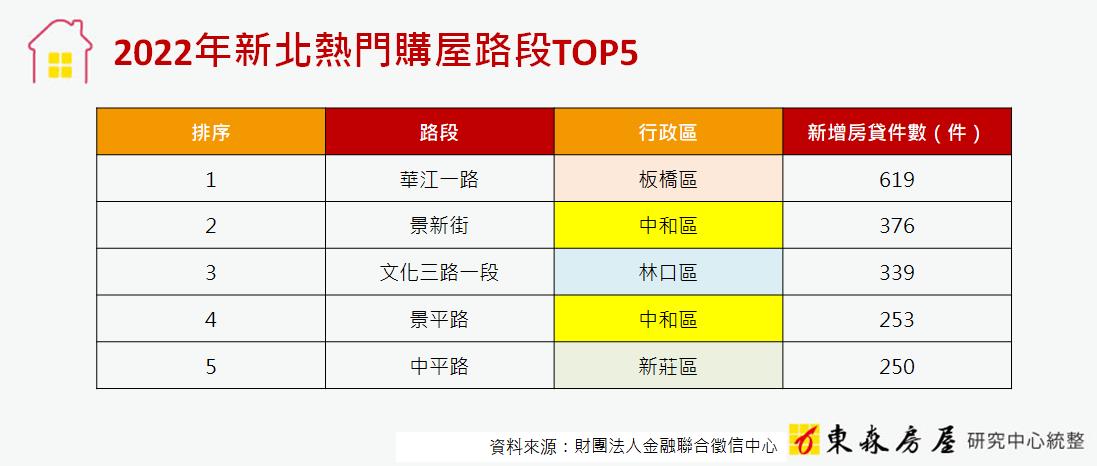 新北緊鄰台北,是大台北生活圈的重要成員,憑藉相對親民的房價和優越的地理位置,近年來磁吸了不少脫北族的入住,市況相當火熱,但是新北最熱門的買房區域究竟在哪邊呢?依據財團法人金融聯合徵信中心資料顯示,2022年新北市以位於板橋區的華江一路申貸件數最多,新增房貸件數高達619件,其後分別是景新街(376件)、文化三路一段(339件)、景平路(253件)、中平路(250件)。對此,東森房屋業務經理洪鈞昊指出,以上5條熱門購屋路段都是兼顧生活機能與發展願景的區域,顯見買房選地段是今年購屋者的重點考量因素。