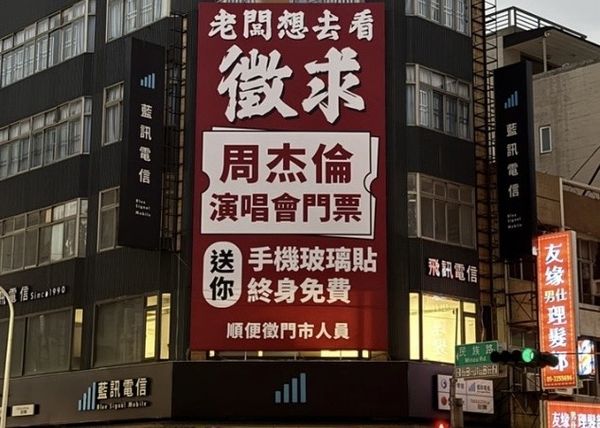 周杰倫台北大巨蛋演唱會一票難求,一開賣售票網站就塞爆,沒幾分鐘票就賣光,不少粉絲崩潰,有網友在臉書社團《嘉義多一點》PO出一張照片,照片中的嘉義通訊行直接掛出高達3層樓的廣告看板,宣告「老闆想去看,徵求周杰倫演唱會門票,送你手機玻璃貼終身免費。順便徵門市人員。」