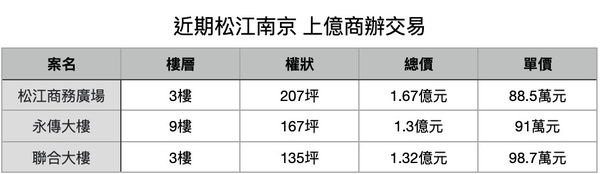 近期台北市中山區、松江南京一帶出現不少總價上億元的商辦交易,包括松江路「永傳大樓」、南京東路一段「聯合大樓」等等。