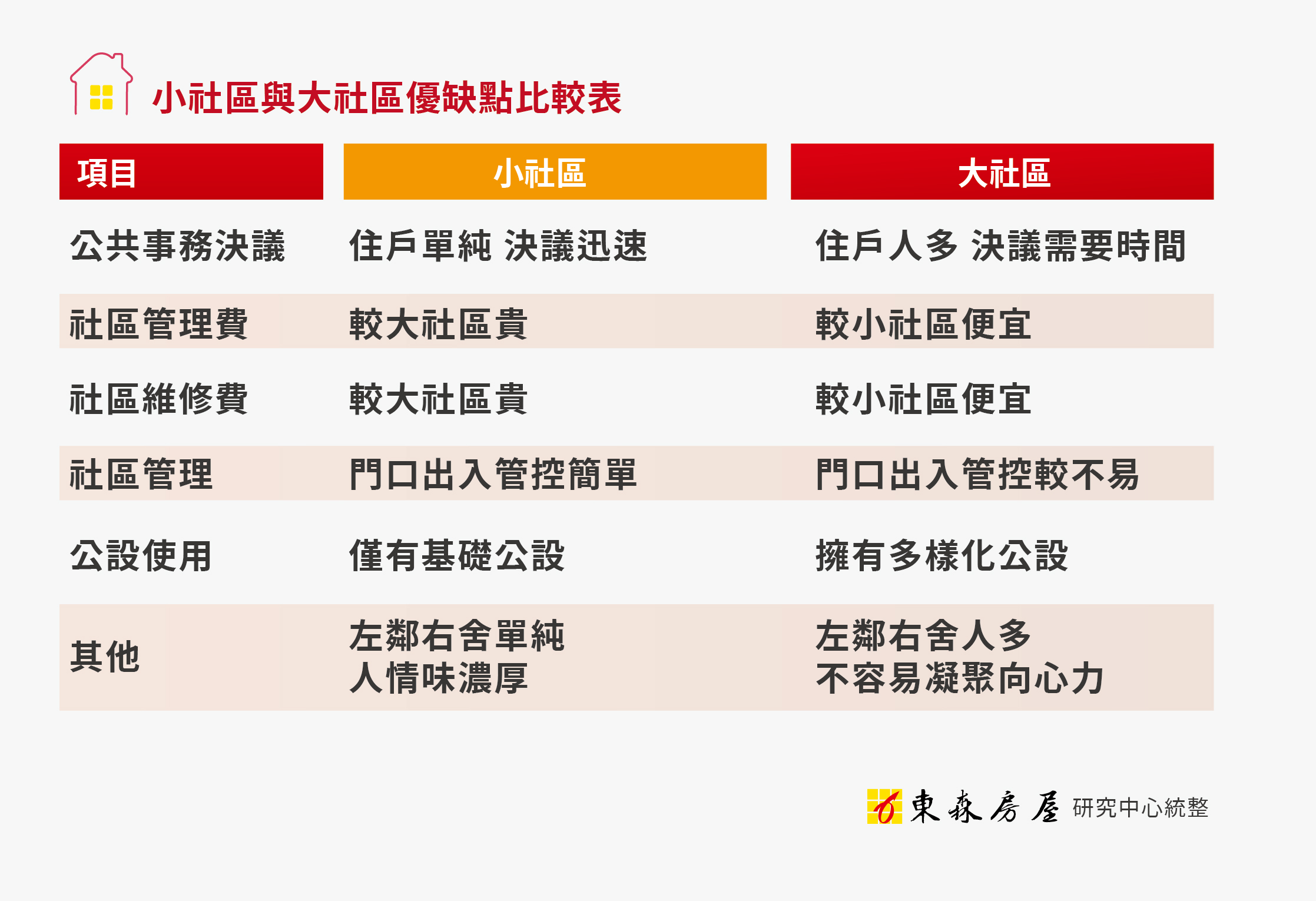 東森房屋研究中心副理謝欣亞分析,小戶數的社區,擁有社區開管委會決定快的優點,任何問題都能提出並迅速有效解決,另外公設如電梯使用,也不容易在上班時間遇到無法使用的狀況。最後在鄰居相處方面,小社區的鄰居往來單純很多,左鄰右舍都是熟悉的面孔,對大廳管理員而言,日常出入能夠比大社區更精準掌握。